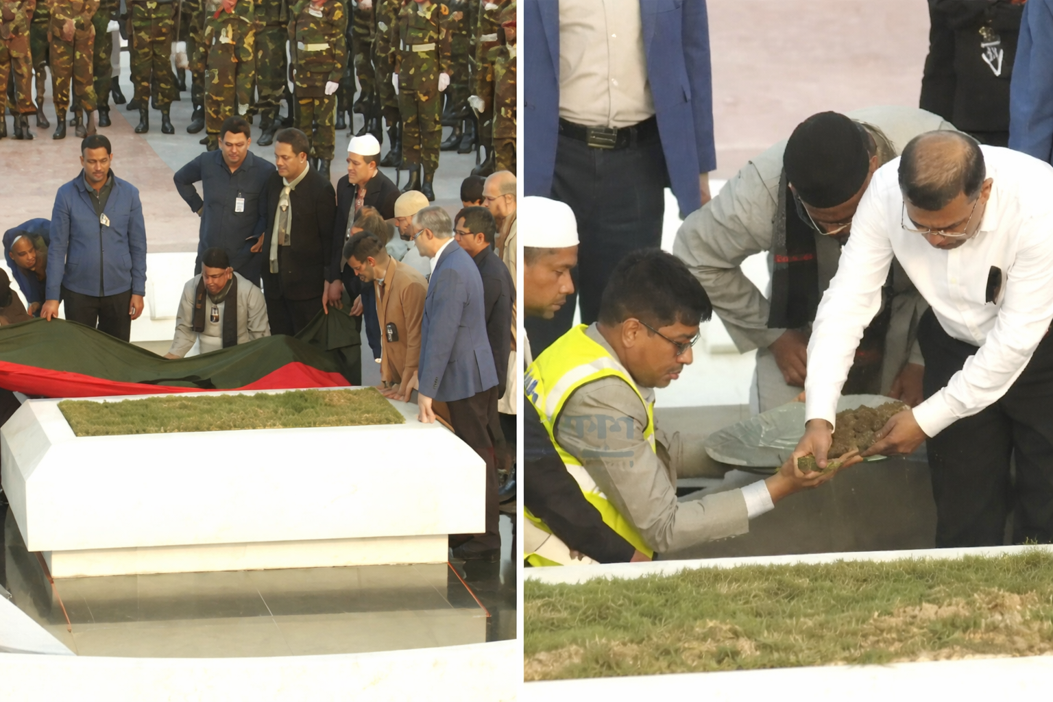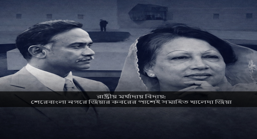 বাংলাদেশের তিনবারের সাবেক প্রধানমন্ত্রী এবং বিএনপির চেয়ারপারসন বেগম খালেদা জিয়াকে পূর্ণ রাষ্ট্রীয় মর্যাদায় তাঁর স্বামী, সাবেক রাষ্ট্রপতি জিয়াউর রহমানের কবরের পাশে সমাহিত করা হয়েছে। বুধবার (৩১ ডিসেম্বর) বিকেল সাড়ে ৪টায় রাজধানীর শেরেবাংলা নগরে সেনাবাহিনীর সুসজ্জিত একটি দলের ‘গার্ড অব অনার’ প্রদানের মাধ্যমে তাঁর দাফন সম্পন্ন হয়। পরিবারের সদস্য, দলীয় নেতা-কর্মী এবং তিন বাহিনীর প্রধানদের উপস্থিতিতে এক শোকাতুর পরিবেশে চিরনিদ্রায় শায়িত হলেন দেশনেত্রী হিসেবে পরিচিত এই নেত্রী।