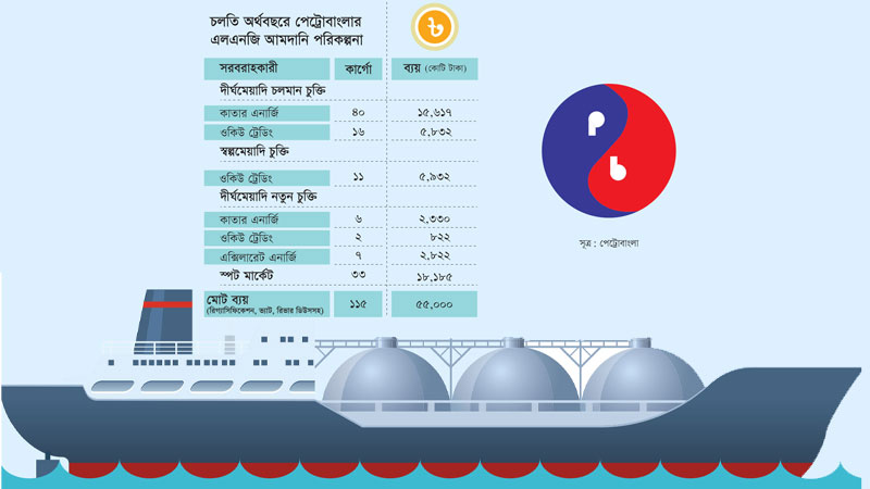 - মোট আমদানির পরিকল্পনা: চলতি অর্থবছরে ৫৫ হাজার কোটি টাকার এলএনজি আমদানির পরিকল্পনা করেছে পেট্রোবাংলা।