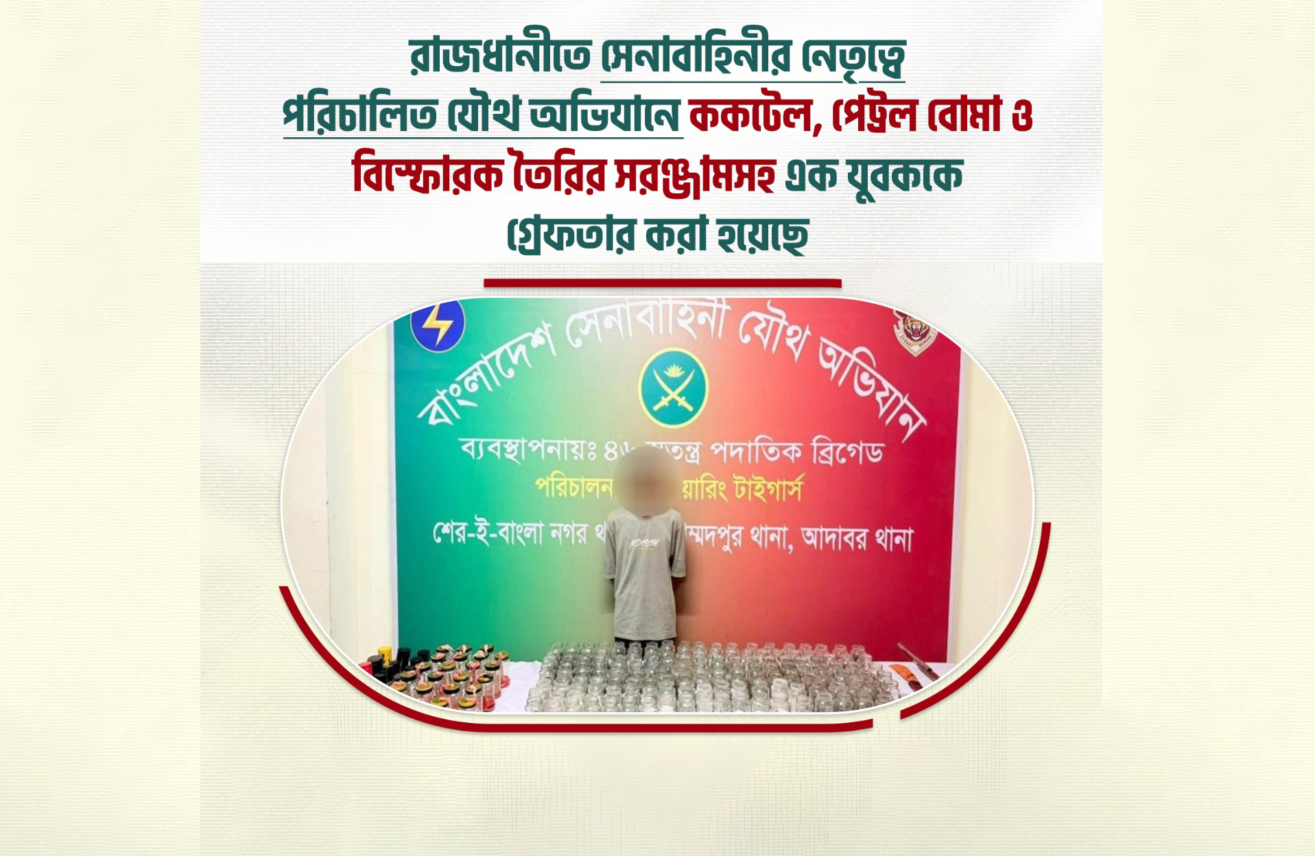 সেনাবাহিনীর যৌথ অভিযান: ককটেল ও পেট্রল বোমা তৈরির সরঞ্জামসহ অপরাধী গ্রেফতার