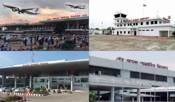 - আন্তর্জাতিক বিমানবন্দর (৩টি): ঢাকা, চট্টগ্রাম ও সিলেট।