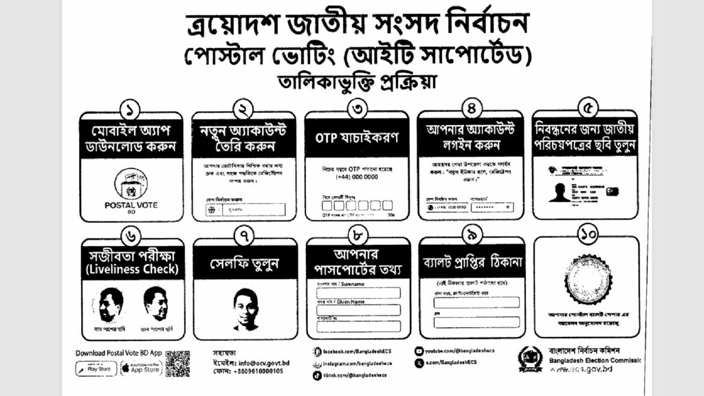 ত্রয়োদশ জাতীয় সংসদ নির্বাচনে প্রবাসীদের ভোটাধিকার নিশ্চিত করতে “পোস্টাল ভোট বিডি” অ্যাপ চালু করেছে নির্বাচন কমিশন। নিবন্ধন থেকে ব্যালট গ্রহণ, ডাকযোগে ভোট পাঠানো এবং গণনার পুরো প্রক্রিয়া নতুন নির্দেশনায় স্পষ্ট করা হয়েছে।